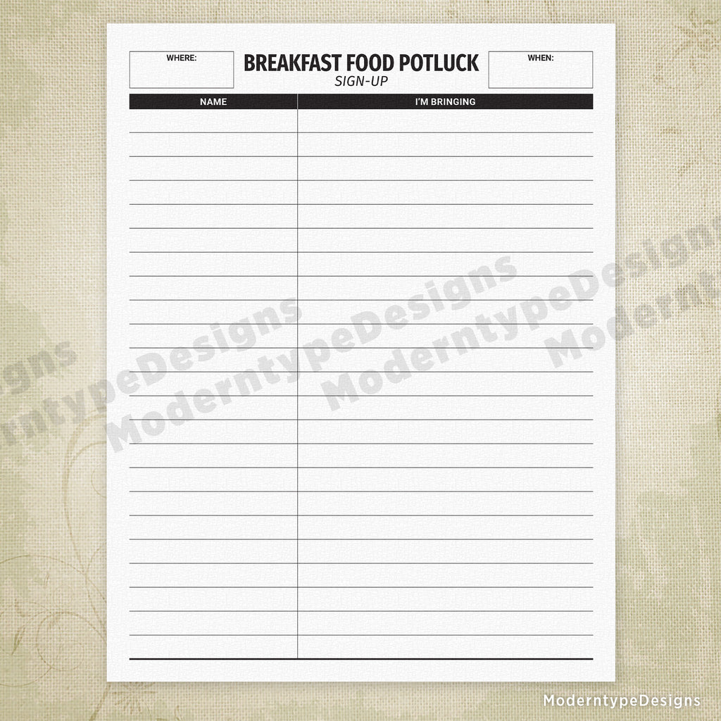 • PDF Breakfast Potluck Sign-up Sheet Form - 8.5 x 11”