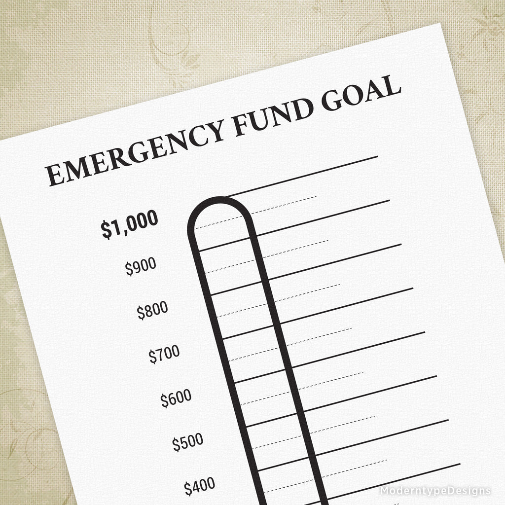 Tracking your $1,000 emergency fund is simple and motivating with this Emergency Fund Goal Printable PDF. Featuring a clear thermometer scale, it visually represents your progress toward your financial safety net.