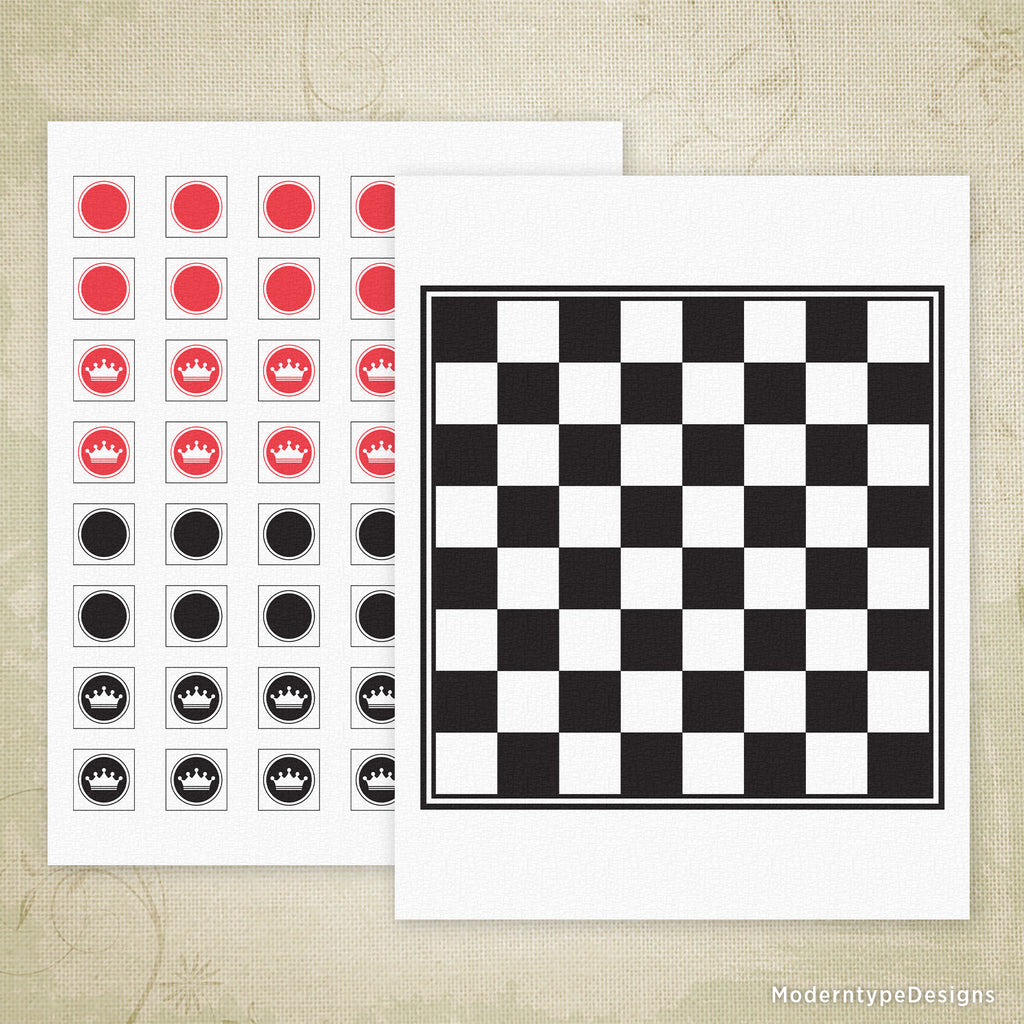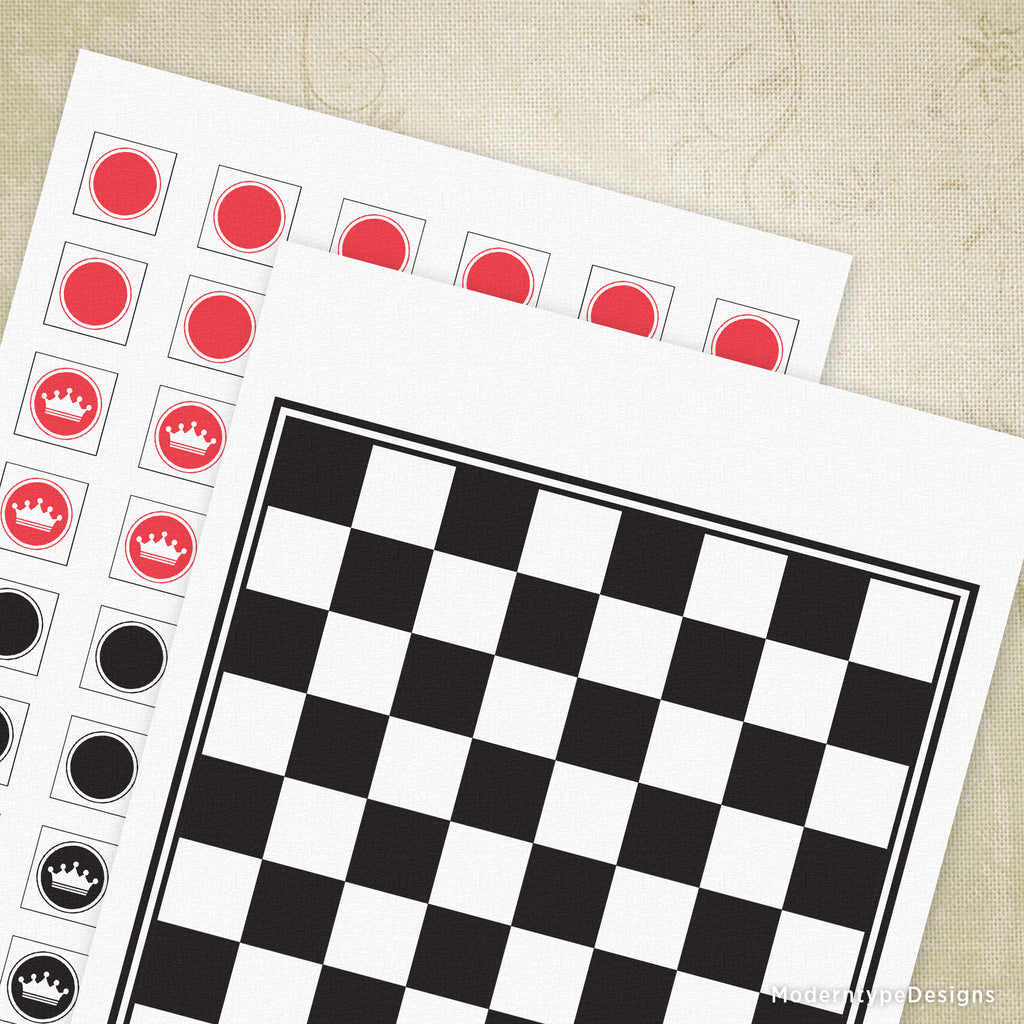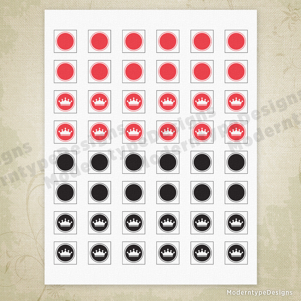 Bring classic strategy gaming to your home with this Checkers with Board Printable PDF set. The package includes a black and white board ready to print, plus red and black checker pieces you can easily cut out yourself. Kings are included for advanced gameplay.